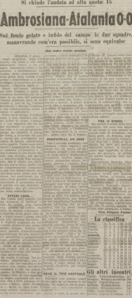 Ciò nonostante un giornale milanese il giorno prima scrive che “non si vede quale onore ci sia nel battere l’Atalanta” in questo caso nessuno visto che proprio non ci battono nonostante la presenza dei tre grandi ex, Bovoli, Salvi e Cominelli, ci sarebbe anche Pozzo che però non gioca, tutti giocatori che abbiamo dovuto vendere per problemi economici.