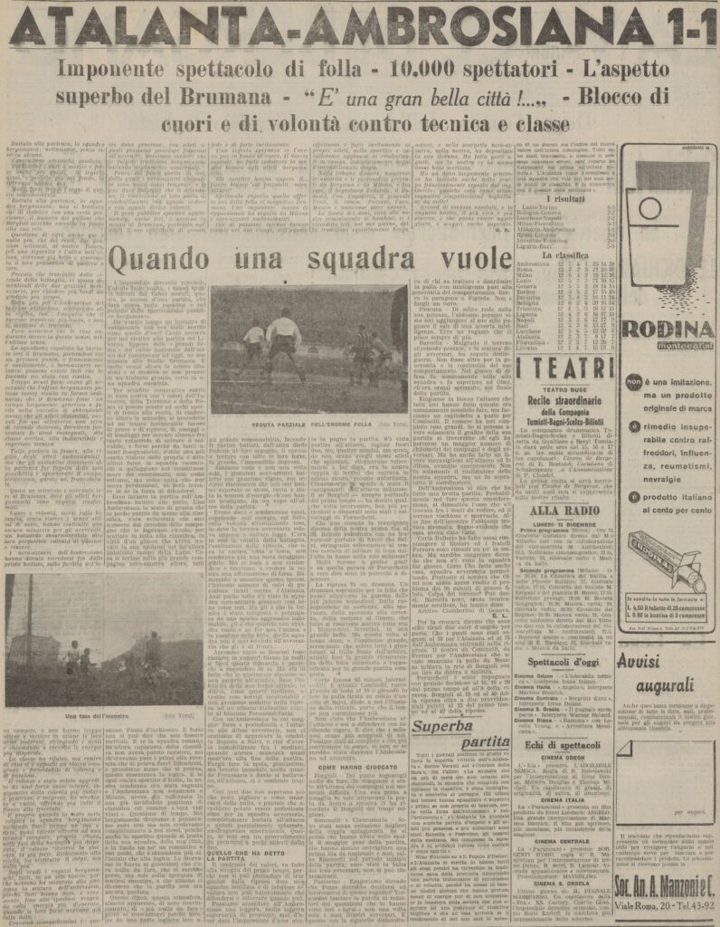 Arriva a Bergamo la capolista solitaria Ambrosiana (cioè l’Inter nella versione fascista, Internazionale è considerato troppo di sinistra) ed è un testacoda, noi al primo anno di Serie A della storia veniamo dati dalla stampa sicuri perdenti, anzi qualcuno scrive che i milanesi hanno la “precisa certezza” di vincere senza usare tutte le proprie armi, sarà sufficiente chiedere ai propri assi “uno spizzico di impegno per mettere sicuramente in ginocchio la rivale plebea”.