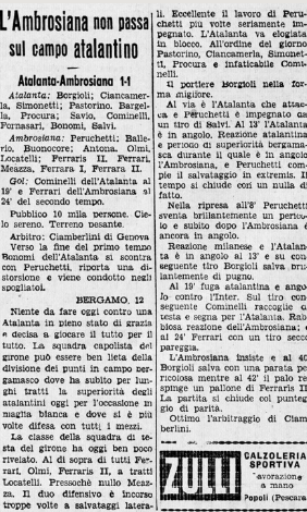 Ce n’è abbastanza per caricare la partita, giornata fredda ma bellissima, 10.000 spettatori (cioè uno sopra l’altro tutti quelli che possono entrarci) tra i quali 3.000 interisti, si stabilisce il record di incasso, 84.000 lire, cifra clamorosa per l’Atalanta dell’epoca.
