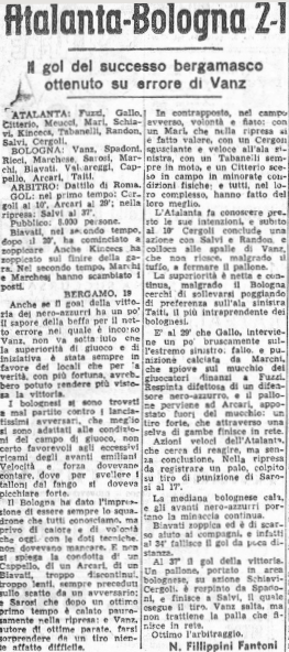 A metà secondo tempo il gol vittoria siglato da Salvi è una mezza papera del poriere bolognese che non tiene un tiro irresistibile, altre fonti lo attribuiscono a Randon, quello che conta è che è il gol fondamentale per conseguire i due punti, finisce 2-1.
