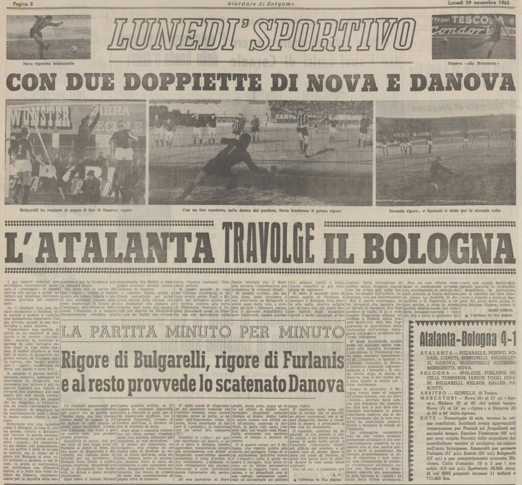 Il Bologna tenta ancora di reagire ma il nervosismo sale, pochi minuti dopo Pesenti e il difensore Tumburus si prendono a palla lontana, il bolognese dà una sberla all’atalantino e il guardalinee lo vede, corsa ad avvertire l’arbitro che stava seguendo l’azione più lontano e Bologna in dieci.