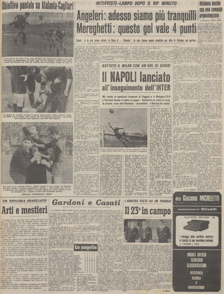 Dietro non corriamo rischi, c’è già un giovane Riva negli ospiti ma è troppo solo per pungere, nella ripresa ricomincia l’assedio, ormai il Cagliari non esce più e Mattrel deve volare un pò ovunque tanto che a metà ripresa in uno scontro si infortuna e deve entrare il dodicesimo, il futuro atalantino Pianta.