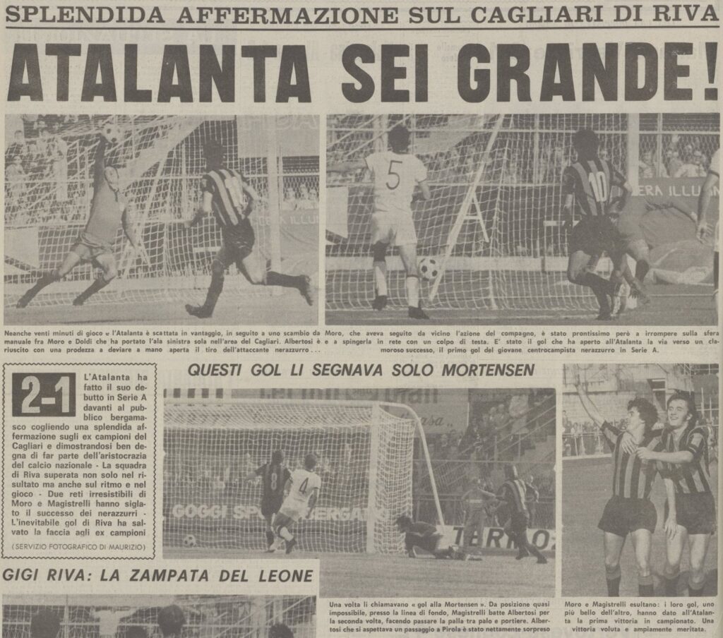 Sono il nove, il dieci e l’undici, MagistrelliMoroDoldi tutto attaccato come uno scioglilingua, insieme in quest’ottimo campionato 1971/1972 qui a Bergamo, insieme nell’Under 21 (con Vavassori) e l’anno dopo, purtroppo, tutti e tre insieme all’Inter che in cambio ci girerà un altro terzetto (Pellizzaro Ghio Reif) che non avrà la stessa fortuna più duecentocinquanta milioni di conguaglio, cioè una notevole cifra.