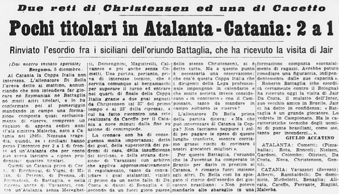 La partita non è particolarmente sentita, siamo in 3.000, certo è anche un pomeriggio feriale, i prezzi sono molto bassi ma non vinciamo in casa da marzo (sono passati nove mesi e c’era ancora il Catania ma nella Serie A precedente, 61/62), il Catania è una squadra di Serie B e giocano molte riserve da ambo le parti, la Coppa Italia ora come allora non suscita grande interesse.