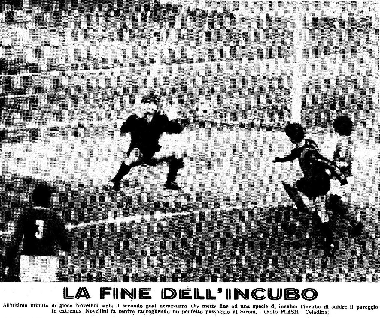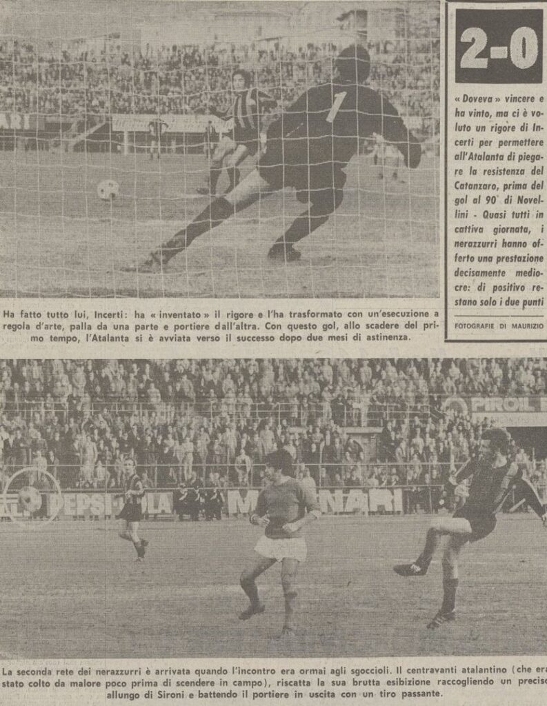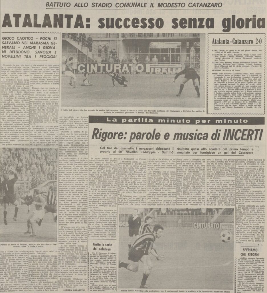 A cinque dal termine del primo tempo Incerti lanciato in area viene affrontato dal libero e vola con una bella piroetta, (è praticamente il Magnocavallo dell’epoca) questa volta forse c’è davvero fallo trasforma lo stesso Incerti.