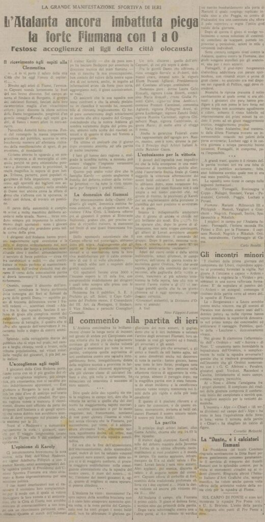 Finisce 1-0, l’aspetto divertente è quello lessicale, ovviamente la squadra fiumana è piena di giocatori il cui cognome non è esattamente italiano, molti finiscono in “ic” , la stampa italiana con totale sprezzo del ridicolo italianizza con risultati a volte comici alcuni cognomi ( il mediano Muzul diventa Musioli, Varglien, che poi allenerà l’Atalanta dei primi anni quaranta, diventa Vaiglieri) mentre lascia con il cognome originale altri giocatori, il tutto senza logica alcuna (c’è il fascismo che logica ci dovrebbe mai essere ?).