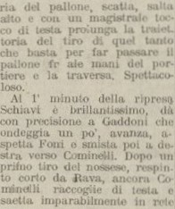 Quando però mancano solo dieci minuti al termine del primo tempo finalmente la partita si sblocca a seguito di un tiro da lontano di Schiavi, Gaddoni lo devia di testa quel tanto necessario e questa volta nessuno può mettere in dubbio la regolarità del meritatissimo gol.
