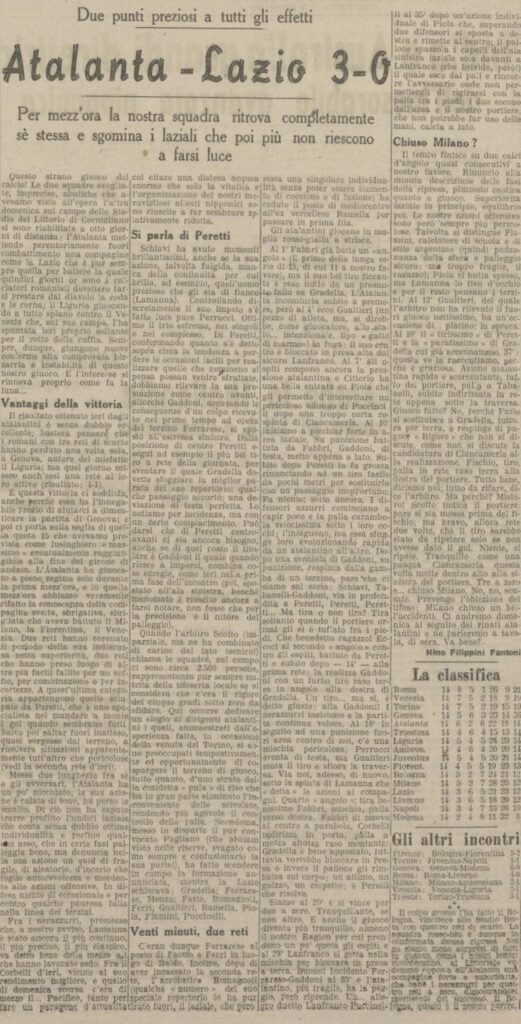 C’è una certa reazione laziale ma il bomber Piola è ben contenuto, nel finale di partita arriva il terzo gol, un altro marcatore che abbiamo imparato a conoscere il terzino rigorista Ciancamerla che non sbaglia dagli undici metri.