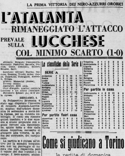 E’ la nostra prima storica vittoria in Serie A, la sigla un gol a inizio ripresa della bandiera Schiavi, giocatore che indossa la maglia nerazzurra dal 1934 al 1948, classico mediano dell’epoca, gran corridore dotato però anche di un certo senso del gol, ne farà sedici in circa quindici campionati che per un mediano marcatore nell’epoca non sono pochi visto che di proiezione offensiva non si parla nemmeno.