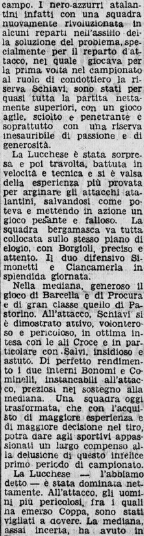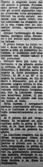 Paradossalmente giochiamo molto meglio nel primo tempo, a inizio ripresa andiamo in vantaggio e ci spegniamo un pò, in compenso si accende la partita, specialmente tra l’atalantino Croce e il lucchese ex atalantino Perduca finisce a scarpate e pure a pugni ma incredibilmente l’arbitro ammonisce soltanto.
