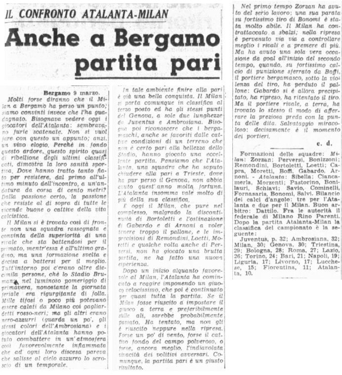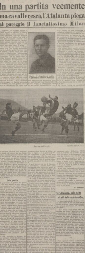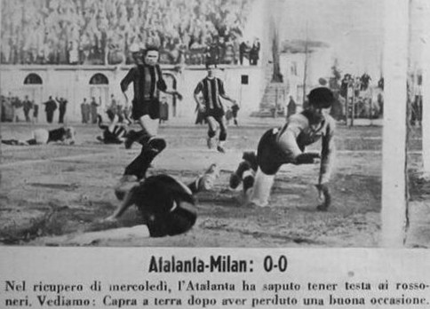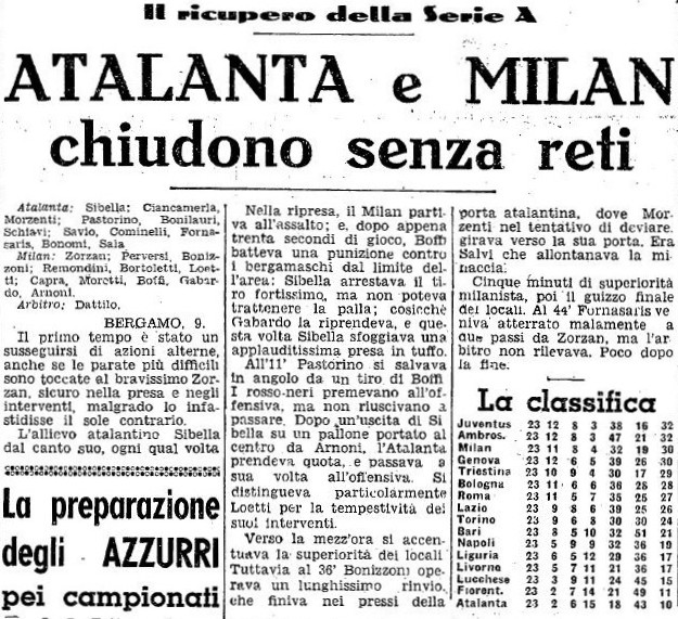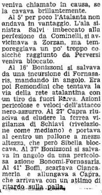 Il nostro portiere, il giovanissimo Sibella, sedici anni, bergamasco di Valsecca se la cava benissimo specie in una parata in due tempi ma il ben più quotato portiere milanista deve volare per fermare una bomba di Bonomi, nel finale c’è probabilmente pure un rigore per netto fallo su Fornasaris che pure il quotidiano milanese sottolinea ma nulla nonostante ci sia il miglior arbitro dell’epoca, Dattilo (o forse proprio per questo).