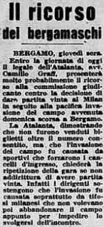 Stadio strapieno, la gente trabocca in campo, milanisti e atalantini mischiati anche se si vedono più bandiere rossonere, l’arbitro Adami aspetta quarantacinque minuti che il campo sia sgombrato, si annuncia all’altoparlante che in caso contrario l’Atalanta avrebbe perso a tavolino.
