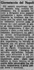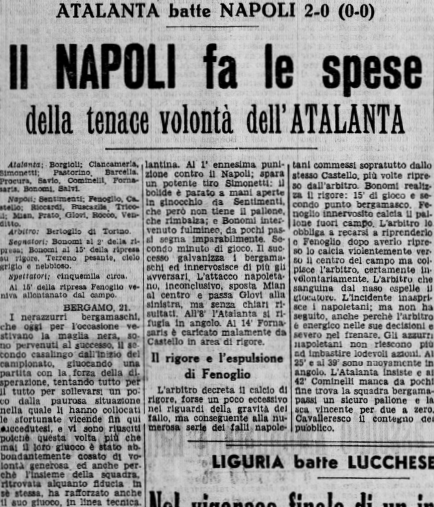 Subito dopo il rigore viene espulso un napoletano in maniera comica, un difensore partenopeo arrabbiato per il raddoppio prende il pallone e lo calcia fuori dal campo, l’arbitro gli impone di andare a riprenderlo, lui ci va ma poi lo calcia stizzito verso il centrocampo solo che, probabilmente involontariamente, colpisce l’arbitro stesso facendolo sanguinare dal naso, il direttore di gara la prende bene cacciandolo fuori, tutto molto d’epoca.