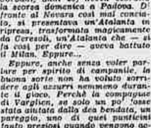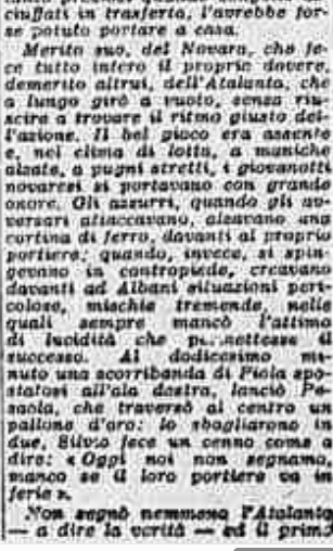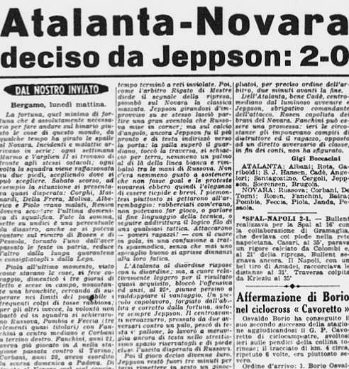 Il secondo gol dello svedese viene citato dalla stampa e ricordato pure dai giocatori novaresi (“Quello è un demonio”), Jeppson si porta avanti la palla di testa, due volte, poi se la passa dal destro al sinistro prima di scaraventare in rete, in tribuna c’è l’ex giocatore del Genoa e della Nazionale De Vecchi (uno che quando giocava veniva soprannominato “Il Figlio di Dio, non uno qualsiasi) che ora fa il giornalista e rimane colpito dal nostro centravanti, ma anche dai terzini Rota e Gariboldi nonché dal nuovo assetto che l’allenatore Ceresoli ha adottato rinunciando ai più esperti Dalmonte e Malinverni.