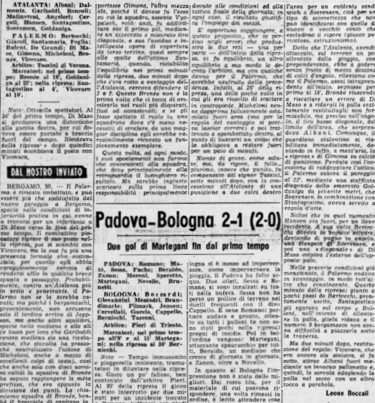 Inizio di campionato difficile, abbiamo ancora in panchina l’inglese Neville e pareggiamo con il Palermo, il primo tempo finisce 1-1, botta e risposta nel giro di quattro minuti, andiamo sotto al diciottesimo, un diagonale sorprende Albani, e pareggiamo al ventiduesimo con Goldaniga (il nonno dell’attuale difensore del Como) che al contrario del nipote è un attaccante anche se di categoria inferiore.
