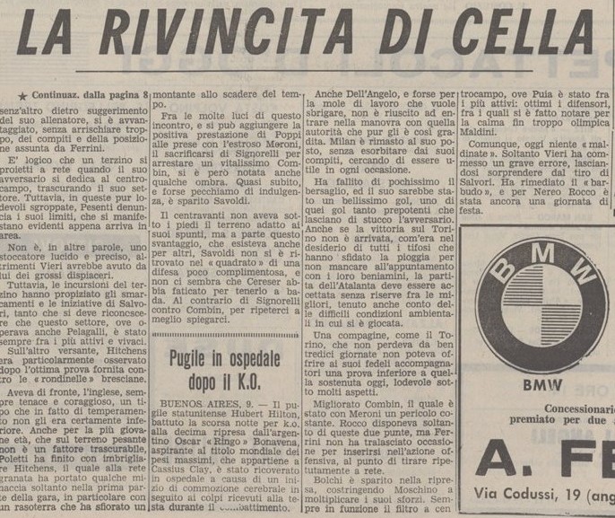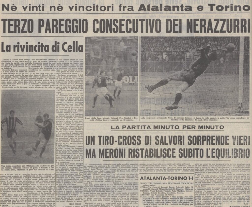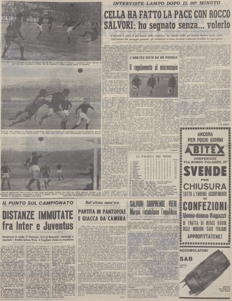 E’ l’ultima partita della stella granata Meroni contro di noi, morirà sei mesi dopo investito dall’auto di un diciannovenne tifoso del Torino che incredibilmente più di trenta anni dopo diverrà presidente della squadra, Tilli Romero.