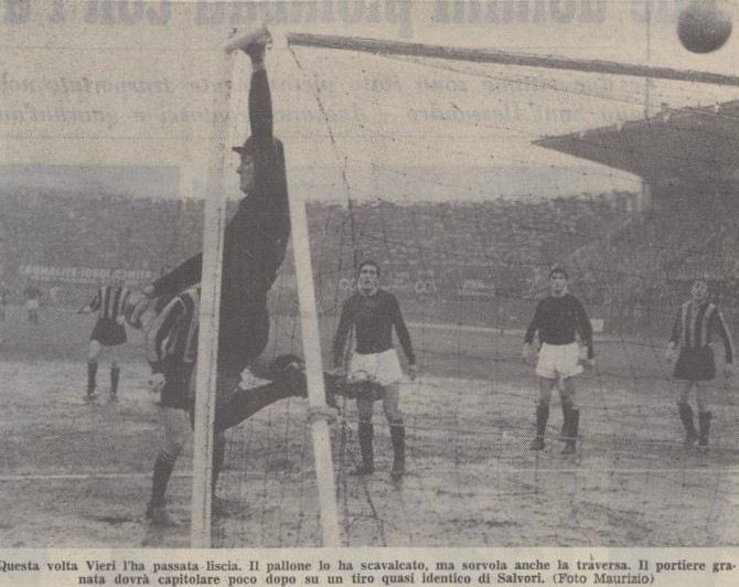 Dieci minuti dopo pareggiano i granata con la loro stella Meroni la nostra difesa si fa sorprendere dalla posizione di Combin inizialmente in fuorigioco e rimane un pò ferma.
