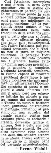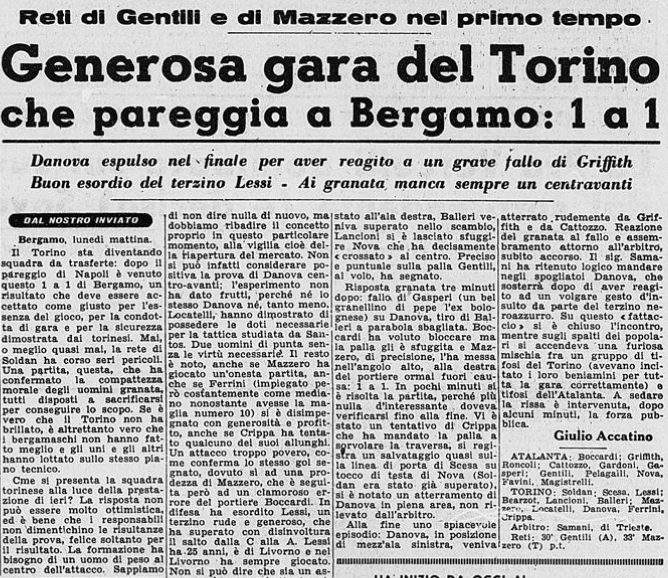 Finisce pari, anzi finisce in rissa in campo e fuori: in campo per un fallo di Griffith sul futuro atalantino Danova si accende una mischia e alla fine a esser espulso per reazione è Danova, sugli spalti per non esser da meno a fine partita si accende una furiosa mischia con i tifosi granata presenti, un antipasto di quanto accadrà quasi venti anni dopo.