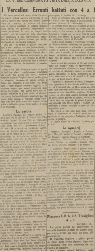 A fine campionato noi arrivando quarti saremo ammessi alla Prima Divisione (la seconda serie dell’epoca) e i Vercellesi Erranti dovranno ritirarsi a poche giornate del termine, il loro presidente cederà metà squadra alla Pro Vercelli, il portiere Cavanna diverrà, pur senza mai giocare, campione del mondo con l’Italia del 1934.
