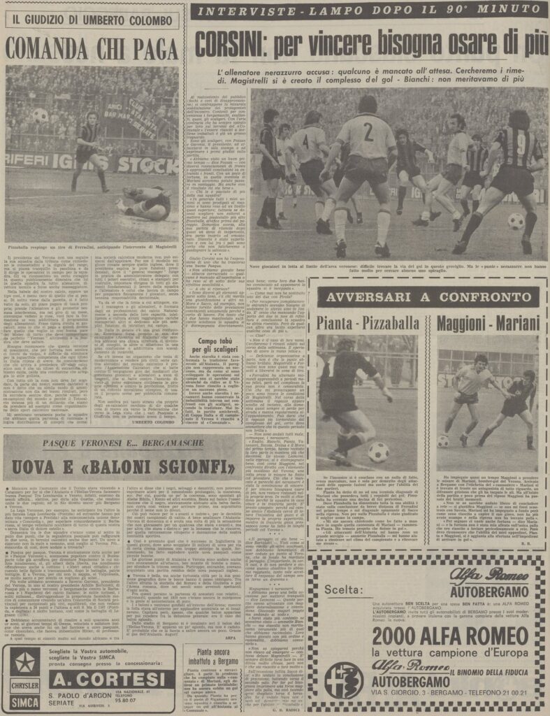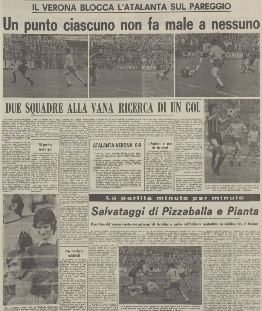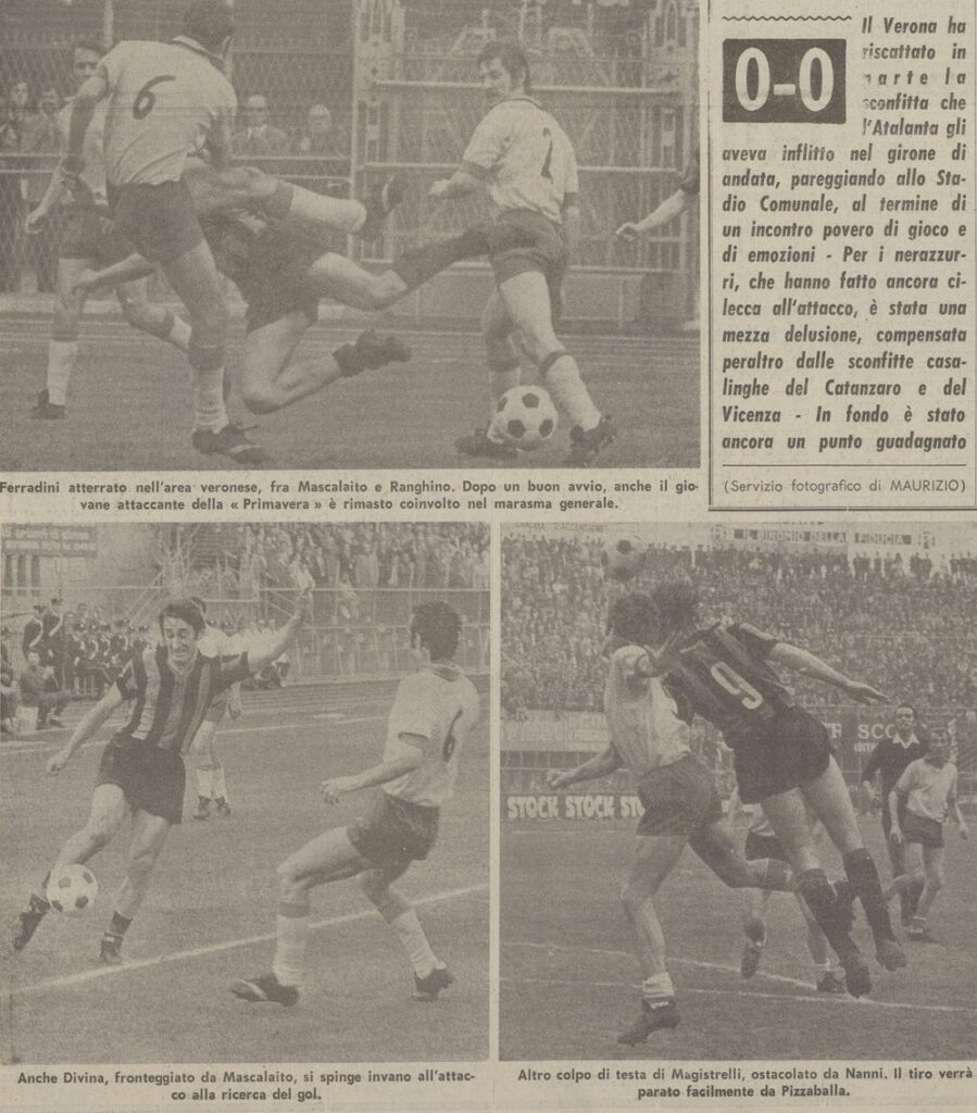 In effetti è Pizzaballa che nella ripresa deve fare una prodezza su tiro di Maggioni, in precedenza su una bellissima azione Moro-Sacco l’ala atalantina si era mangiato il vantaggio toccando debolmente sul portiere veronese a due passi da lui.