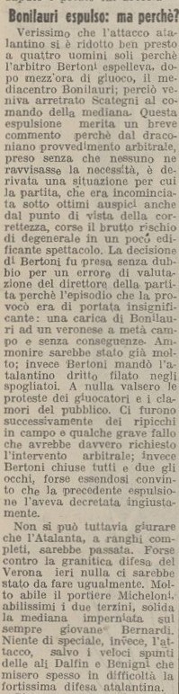La partita è anche condizionata dall’espulsione di Bonilauri alla mezzora del primo tempo, espulsione che viene giudicata assolutamente ingiusta, comminata per un contrasto apparso regolare e comunque non certo da rosso (anche se i cartellini non esistono ancora ovviamente).
