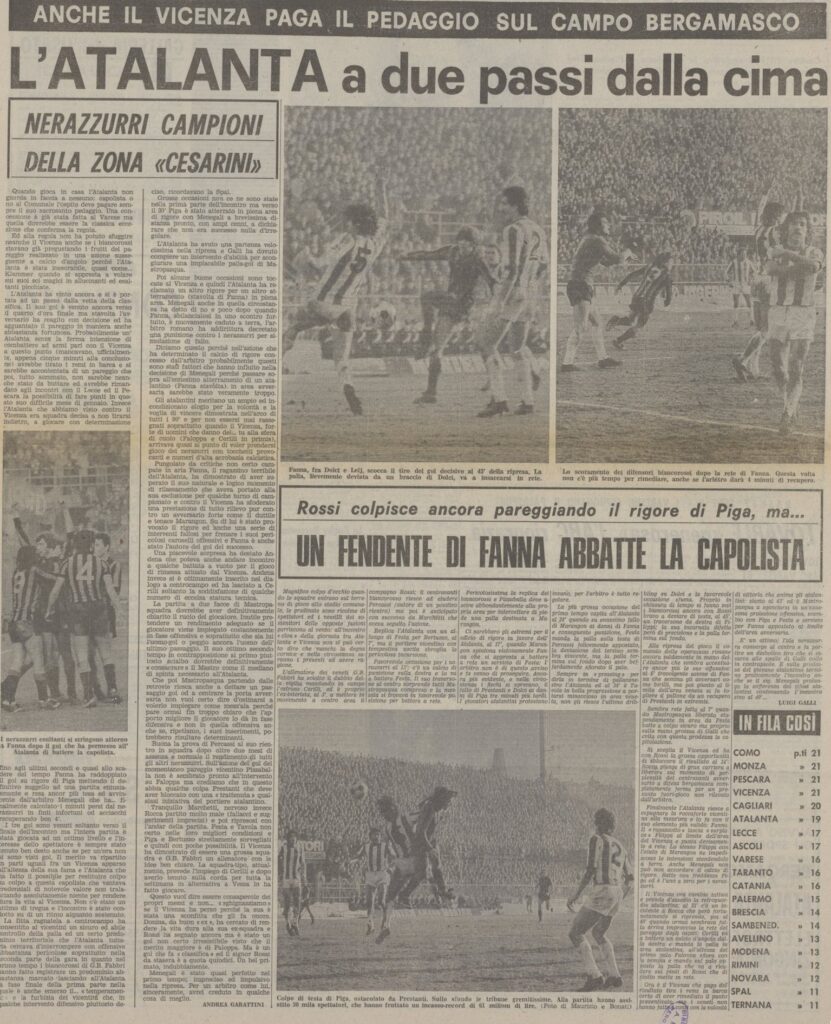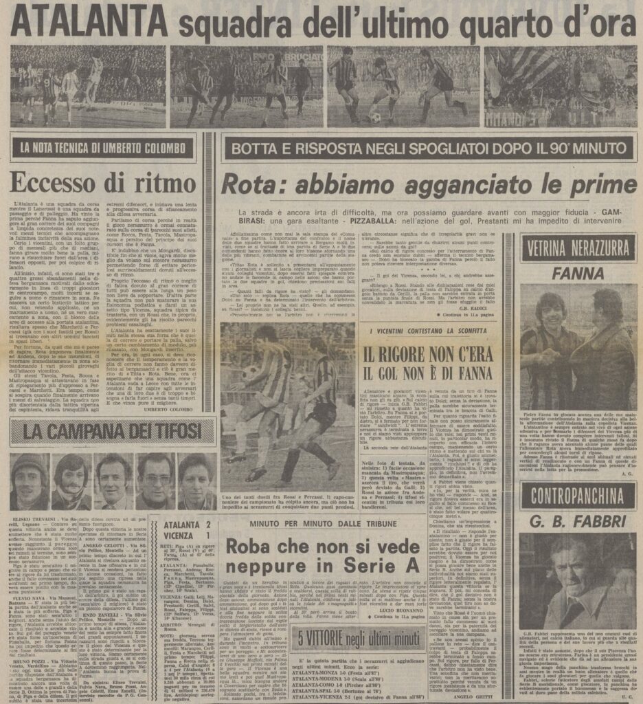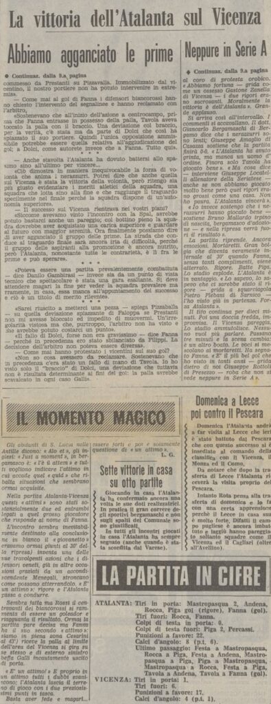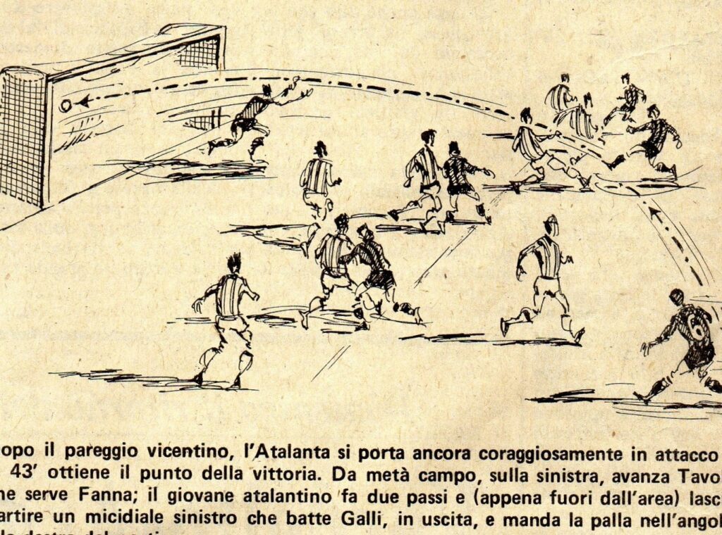 In campo si gioca e si lotta, il Vicenza è pericoloso all’inizio ma il presidente Percassi tiene bene su Rossi e Pizzaballa è sicuro, anche noi creiamo e specie Fanna deve esser fermato con le maniere forti più volte ma purtroppo le punizioni dal limite di Rocca sono tutte ribattute.