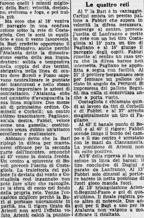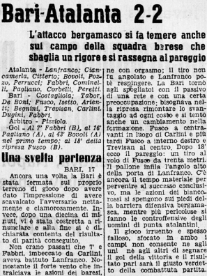 Gli spettatori sono 7.000 e circa la metà sono militari, molti tifano per noi per simpatia (e qualcuno anche perchè è bergamasco), noi siamo più forti ma prendiamo gol dopo otto minuti dal Fabbri pugliese (ce n’è in campo uno per squadra).