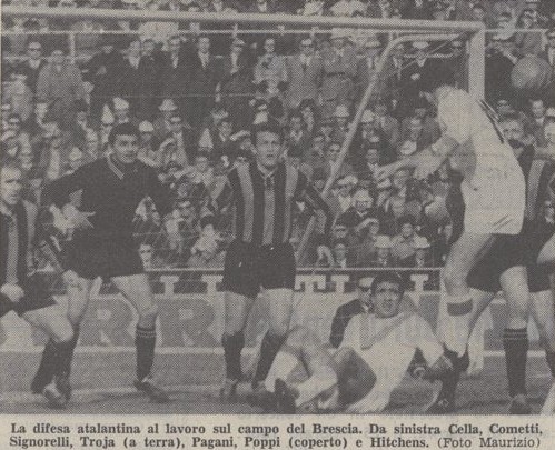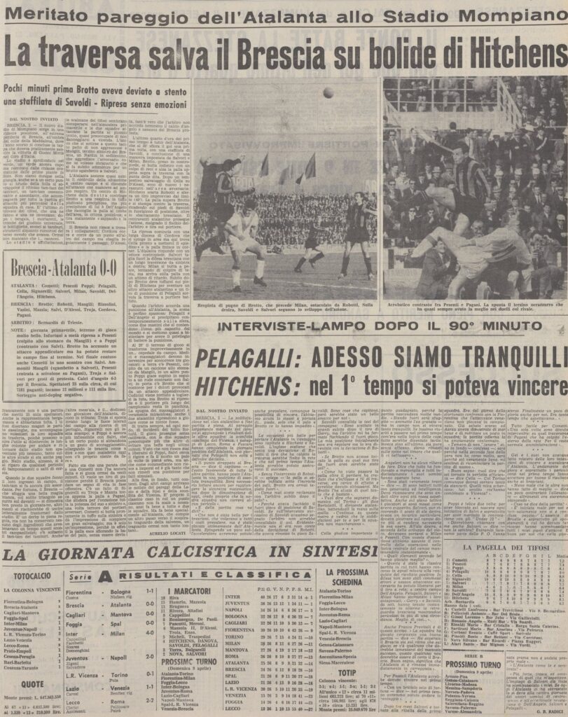 25.000 spettatori, ci sono molti atalantini, i bresciani hanno i tamburi e il cronista ne è sorpreso, l’ambiente è caldo ma la partita no, accade pochissimo, una punizione dal limite per il Brescia, una mezza occasione nostra.