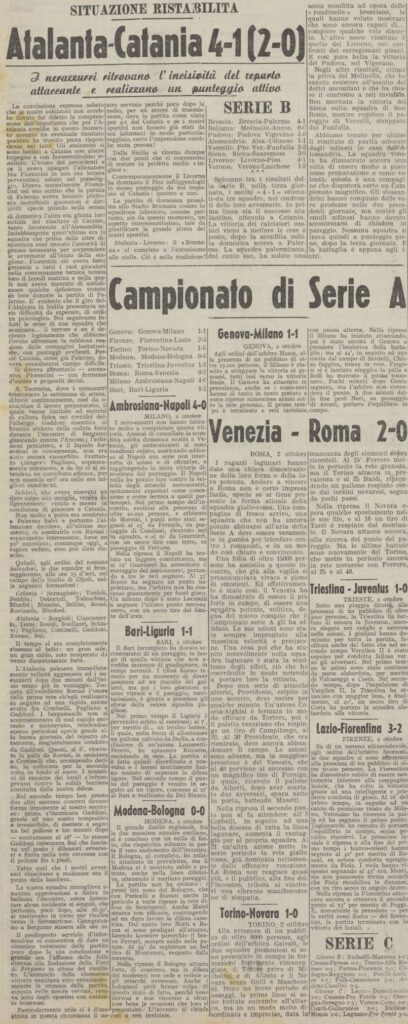 Fuori dalla redazione dei due giornali cittadini vengono esposti risultato e cronaca (telefonati subito al termine della partita) e gli atalantini si affollano a leggere, meno male perchè poi la radio dà l’informazione sbagliata di una sconfitta per 4-1.