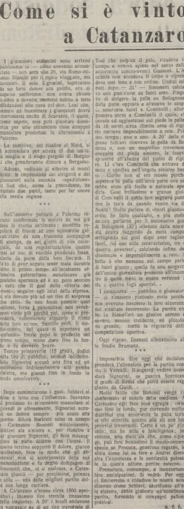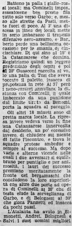 Lo stadio di Catanzaro non è molto grande, 1.500 spettatori per 3.000 lire d’incasso (massimo stagionale per la squadra calabrese) ma l’ambiente è caldo, i locali vanno in vantaggio a metà primo tempo con un tiro in diagonale che prende il palo, sulla respinta il centravanti mette in rete.