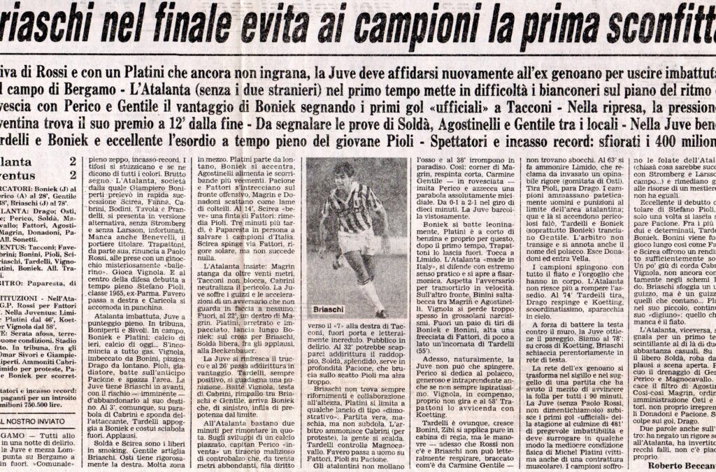 Il primo nel girone di agosto in Coppa Italia, un suo assurdo tiro da trenta metri e una rovesciata di Gentile pareggiano la Juventus in uno spettacolare 2-2.