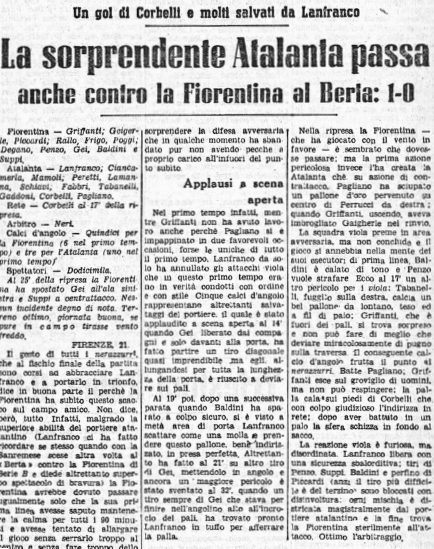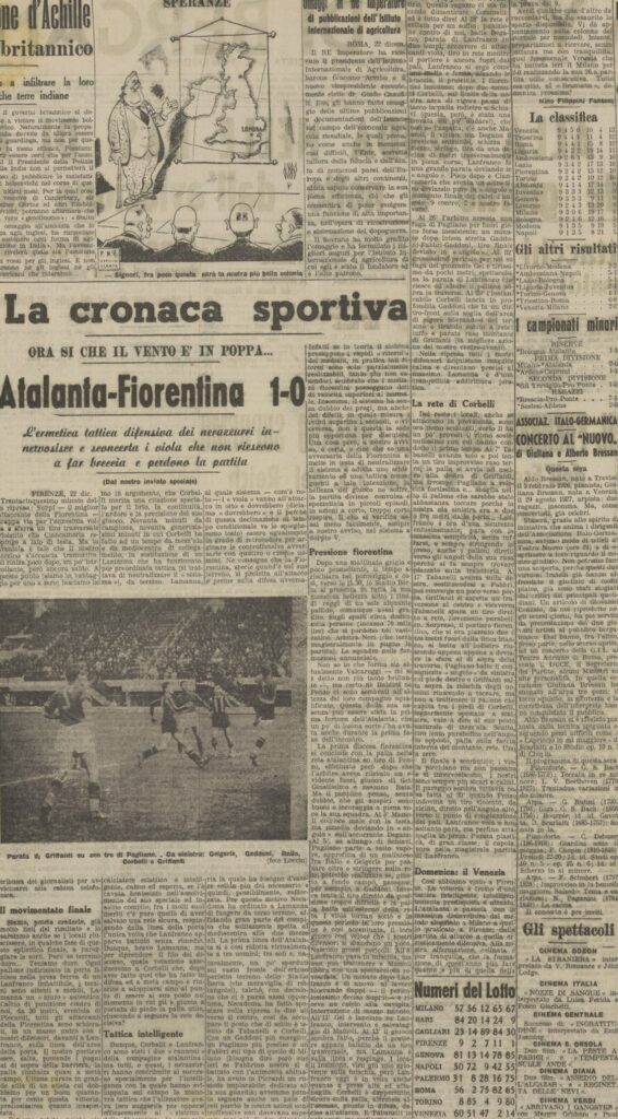 In piena seconda guerra mondiale, dieci giorni dopo l’astuta dichiarazione di guerra agli Stati Uniti, passiamo a Firenze con un gol di Corbelli alla mezzora del secondo tempo.