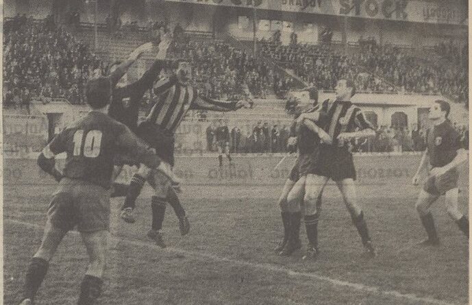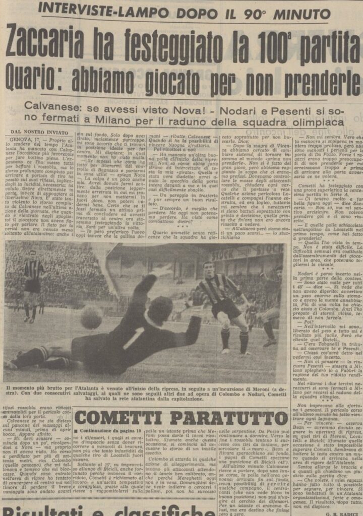 I tifosi locali sono convinti di vincere ma il primo tempo è abbastanza tranquillo, certo ci difendiamo e basta ma Cometti deve fare solo un intervento veramente difficile a fine frazione su colpo di testa di Bean, il più pericoloso però è naturalmente Meroni, il forte fantasista che andrà poi al Torino e in nazionale e morirà nel 1967 investito in pieno centro a Torino.