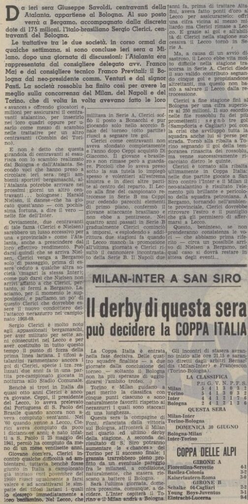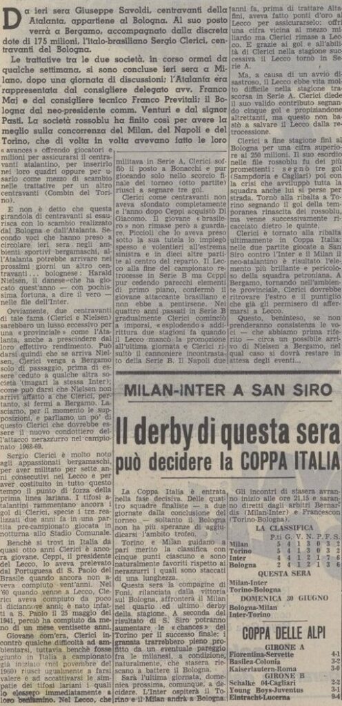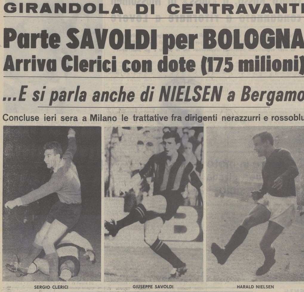Nell’estate 1968 Savoldi va al Bologna per Clerici e 175 milioni, è la solita operazione necessaria per il bilancio atalantino, l’esito in questo caso sarà disastroso, arriveremo ultimi e retrocederemo, magari non solo per colpa di Clerici che comunque farà nove gol non così tanti meno dei dodici di Savoldi.