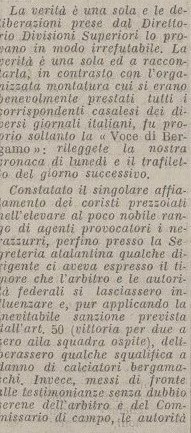 L’articolo inizia con la descrizione di un’Atalanta che domina in campo e prosegue con la gustosa descrizione di tutta una serie di frasi in dialetto degli atalantini in tribuna, tutta da leggere.