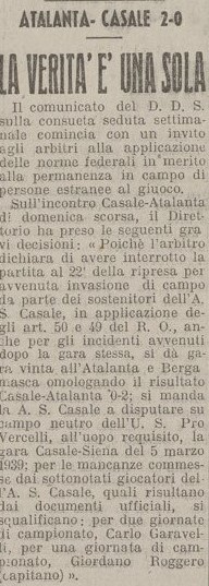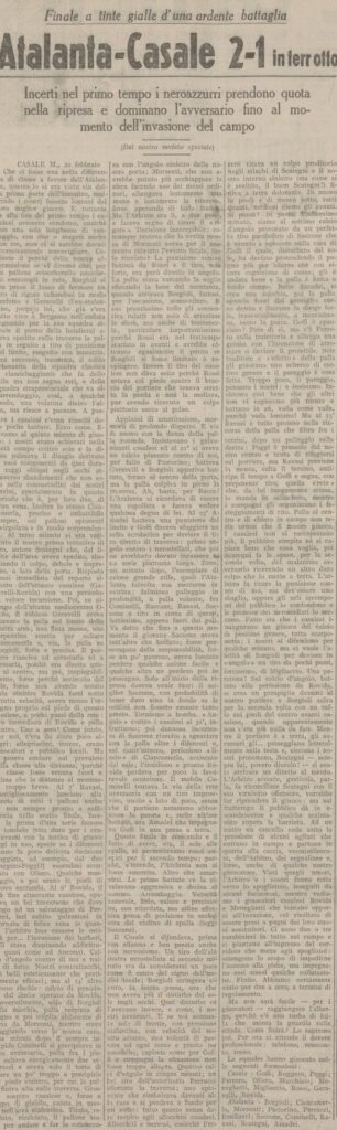 Stiamo vincendo a Casale quando c’è un’invasione di campo, arbitro e atalantini scappano negli spogliatoi ma vengono ugualmente colpiti, perfino qualche giocatore locale che cerca di fermare gli invasori si prende qualche pugno.