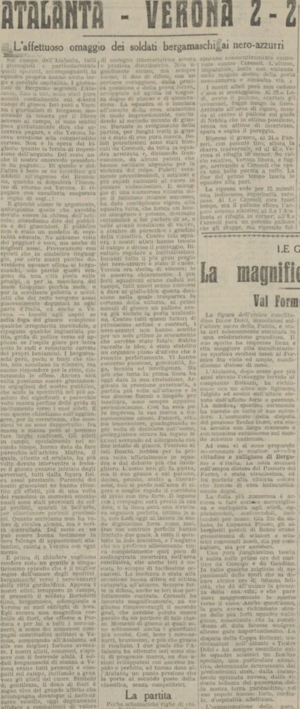 A parte la questione biglietto è il comportamento del pubblico veronese che insulta i bergamaschi presenti in campo e fuori (ci sono i soliti soldati bergamaschi in gran numero, uno di loro offre prima dell’inizio dei fiori al capitano atalantino Perduca) con insulti che dal racconto potremmo individuare in montanari, gozzuti (per Gioppino) e qualcosa riferito alla polenta e uccelli (questa è più difficile).