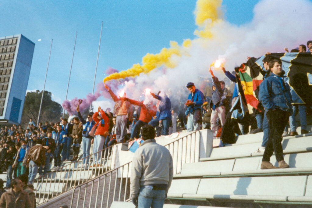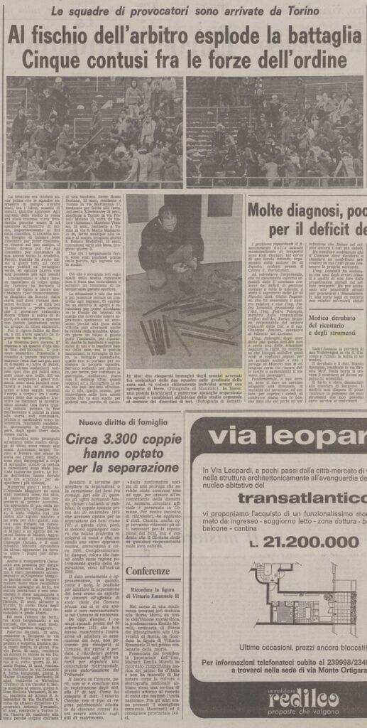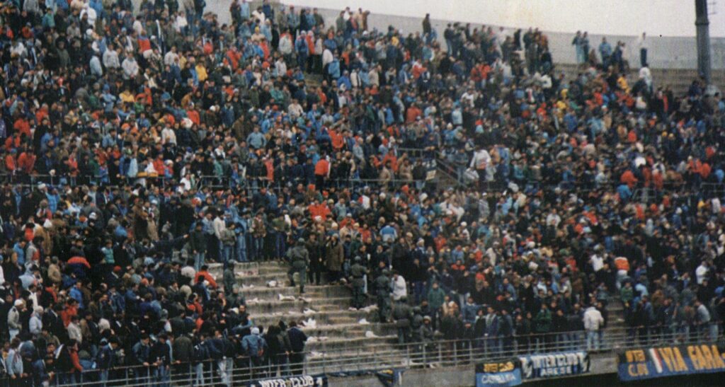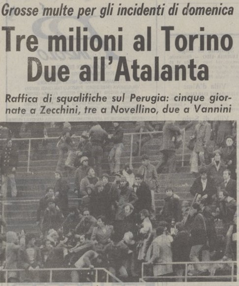 Dopo la partita già abbastanza nervosa ci sono scontri tra atalantini e milanisti che non si fanno problemi a usare i coltelli, uno si vede pure nella fotografia.