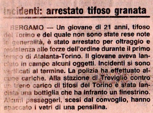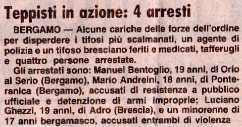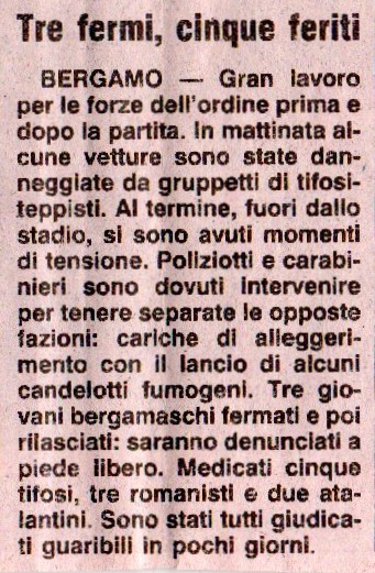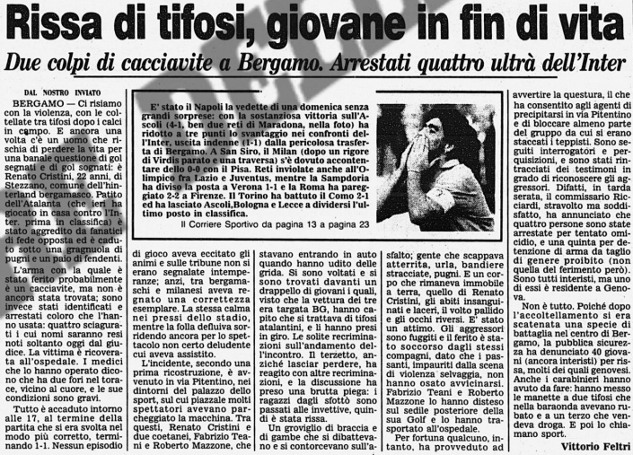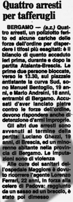 Dopo la partita, in una rissa in Via Pitentino, un atalantino è accoltellato dagli interisti. alcuni dei quali poi arrestati.