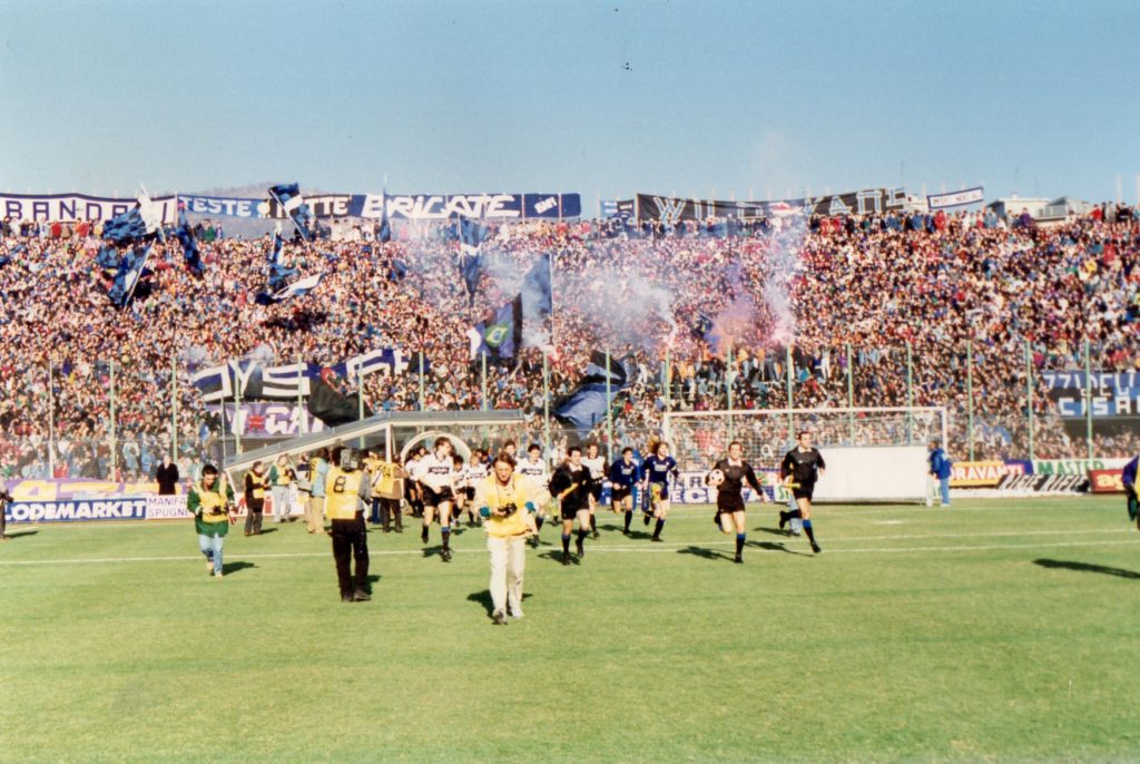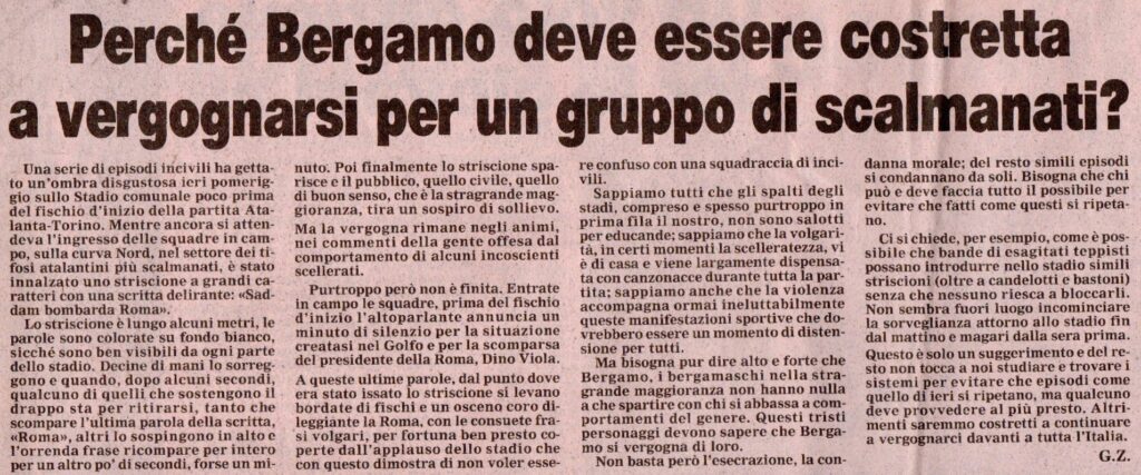 In Nord striscione, anche abbastanza ridicolo, sulla Guerra del Golfo, “Saddam bombarda Roma” cori e “canzonacce” nel minuto di raccoglimento per la scomparsa del presidente della Roma Viola.