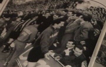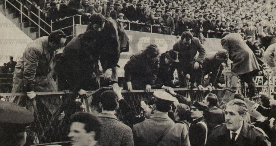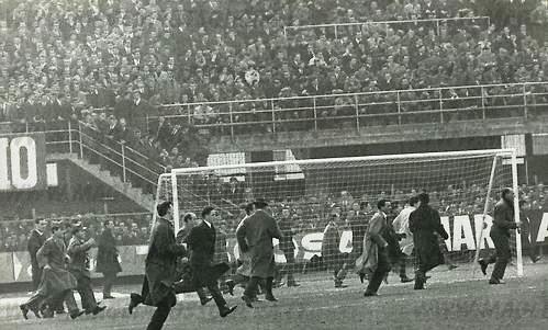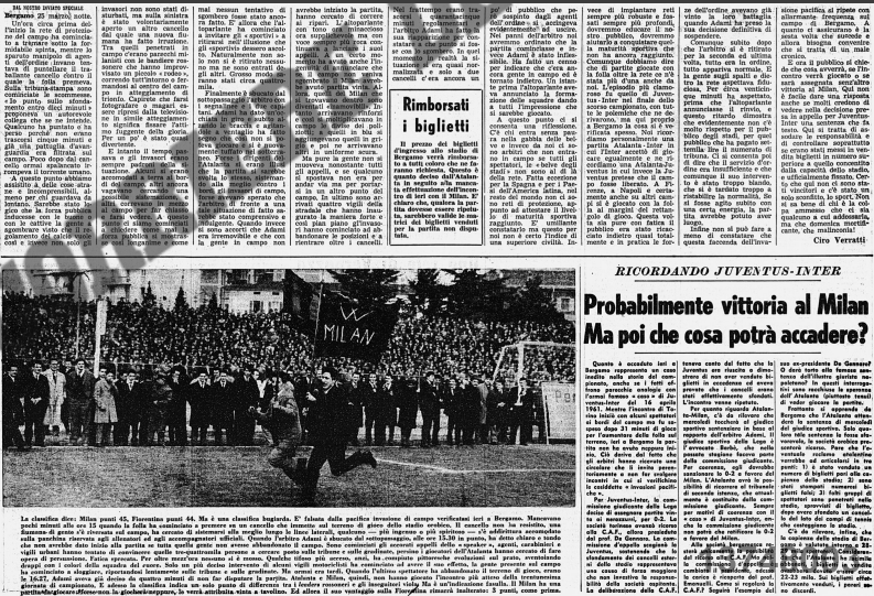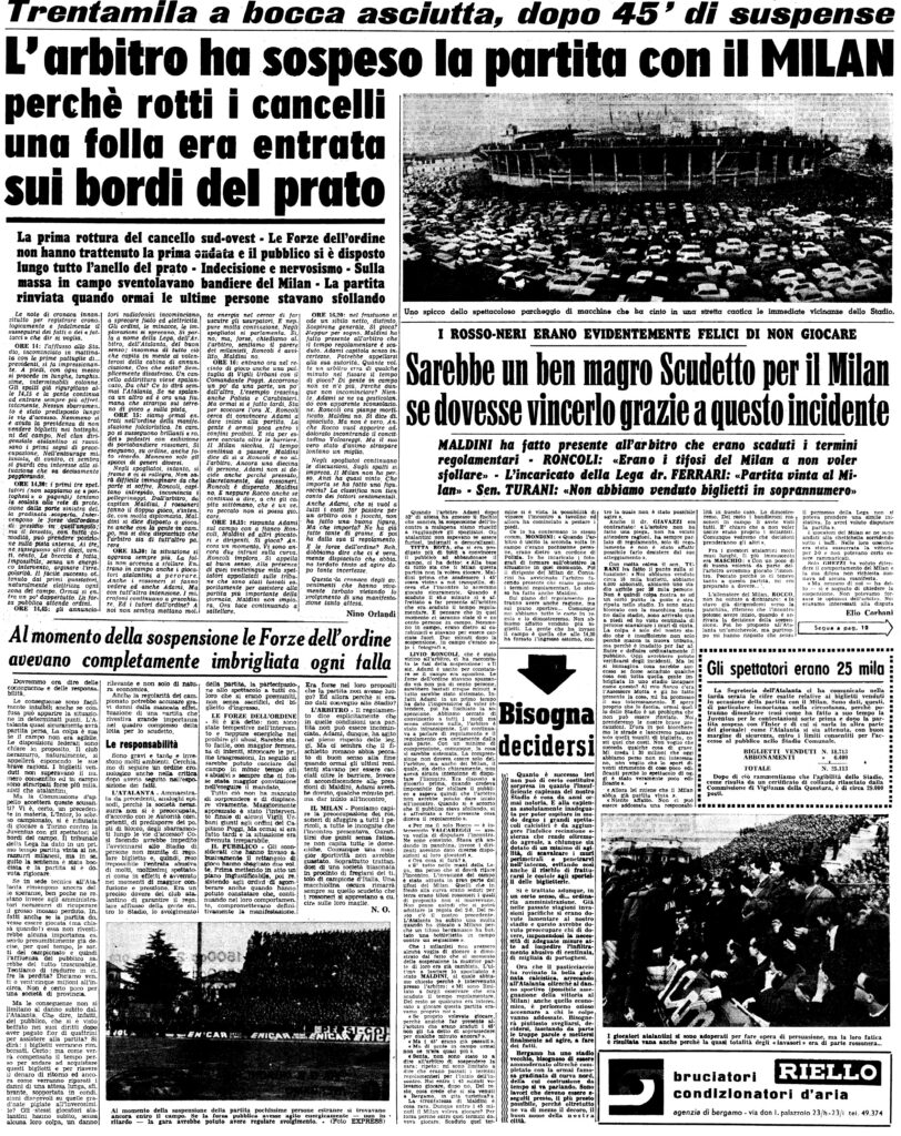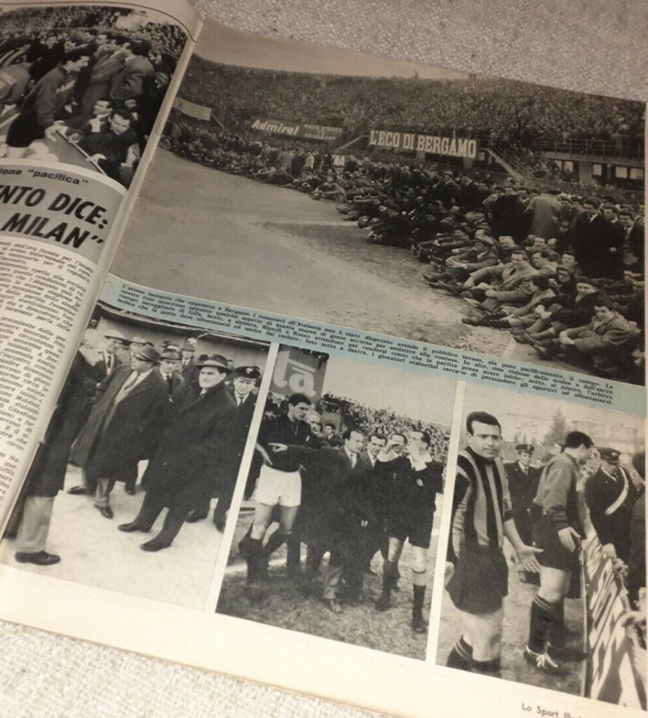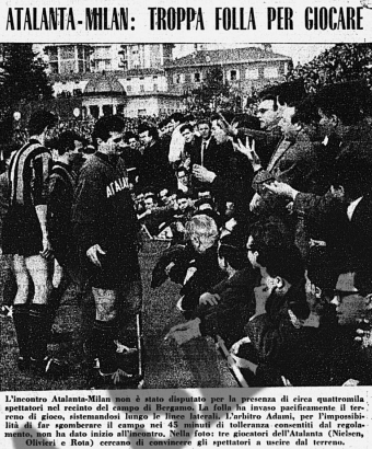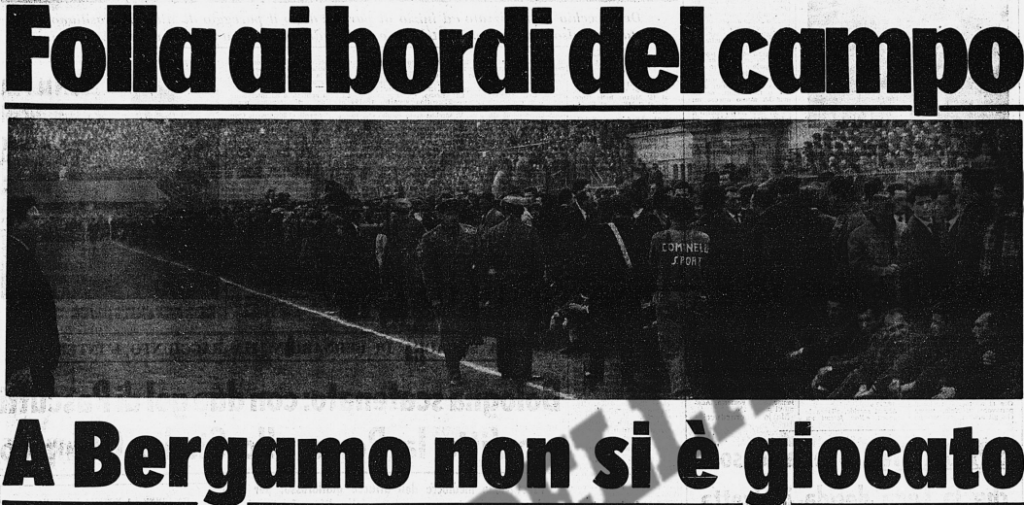 Stadio strapieno, la gente trabocca in campo, milanisti e atalantini mischiati anche se si vedono più bandiere rossonere, l’arbitro Adami aspetta quarantacinque minuti che il campo sia sgombrato, si annuncia all’altoparlante che in caso contrario l’Atalanta avrebbe perso a tavolino.