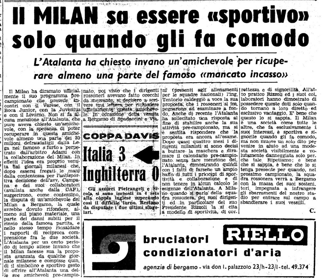 Nella stessa estate del 1962 l’Atalanta si aspetta che, come promesso, i rossoneri vengano a giocare un’amichevole precampionato per risarcire almeno il grande danno economico subito dovendo rimborsare i biglietti della partita non giocata.