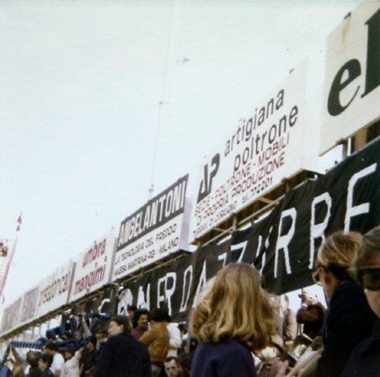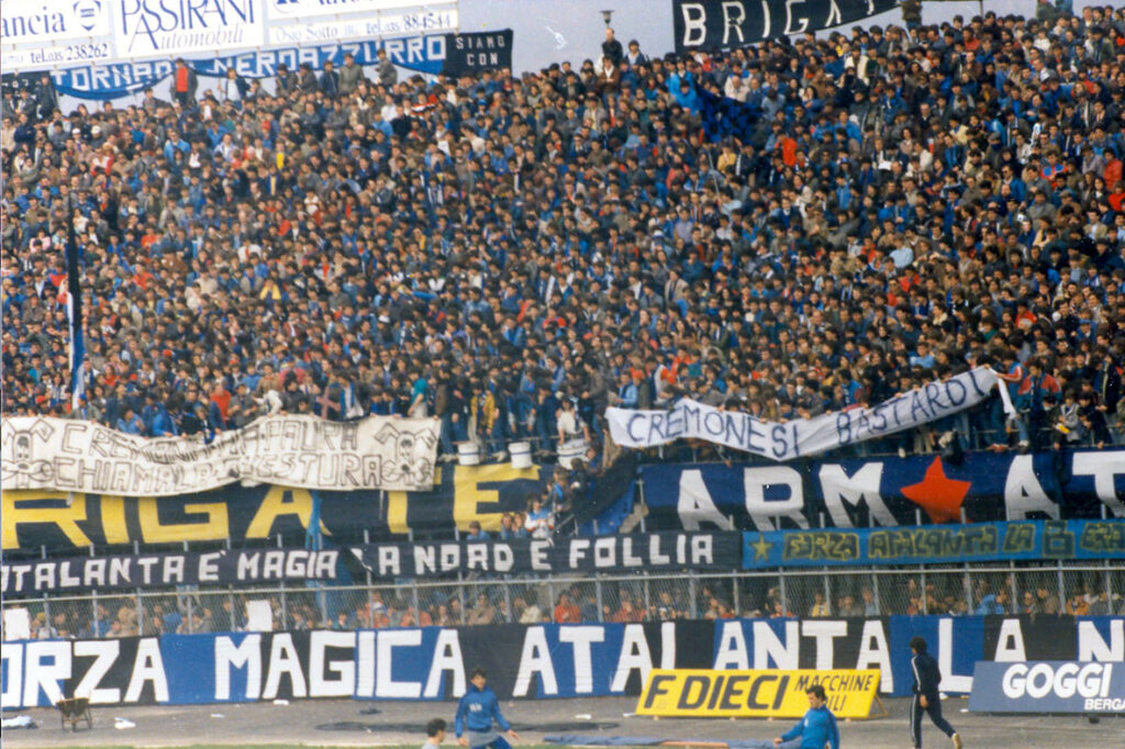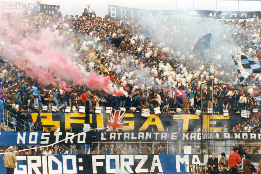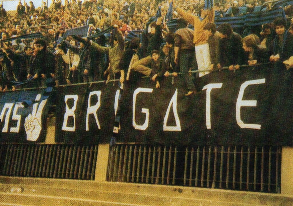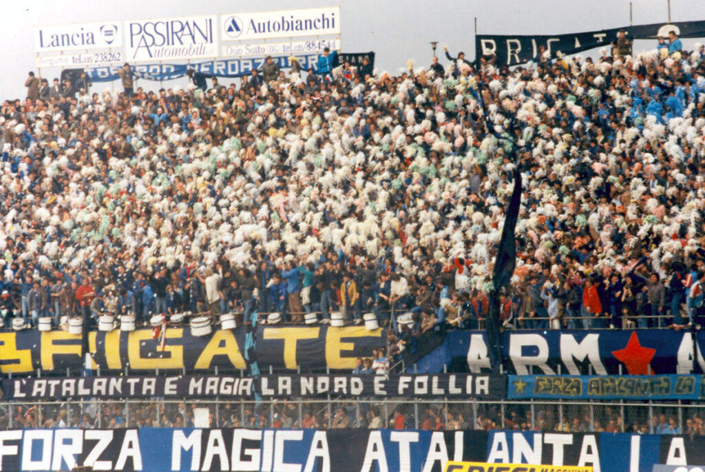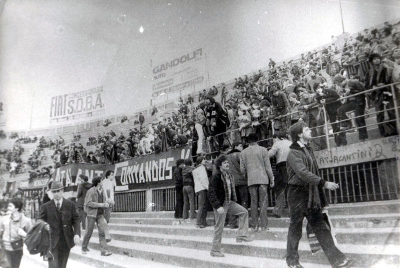 Il famoso sasso di Perugia, stiamo retrocedendo, il Perugia arriverà secondo, abbiamo appena preso il primo gol e un sasso colpisce il nostro portiere Bodini, lanciato dalla curvetta dove ci sono i tifosi atalantini (ma non solo, non esiste ancora il settore solo ospiti) chiaramente riconoscibili dallo storico striscione delle Brigate.