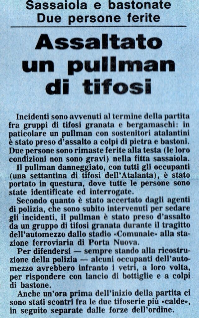 Mentre in campo perdiamo uno scontro diretto decisivo con due espulsioni a fine partita ci sono scontri con i bolognesi che lanciano sassi contro i bus bergamaschi.