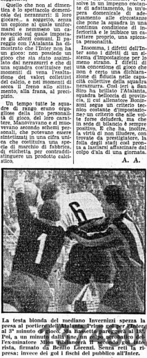 E’ uno dei preziosissimi gol salvezza del “centravanti minatore”, il veneto Mion che era emigrato in Belgio per fare il minatore (come tanti italiani dell’epoca, ricordiamo la tragedia di Marcinelle), poi giocando nella squadra belga del Charleroi si era fatto notare tanto da esser acquistato dall’Atalanta.