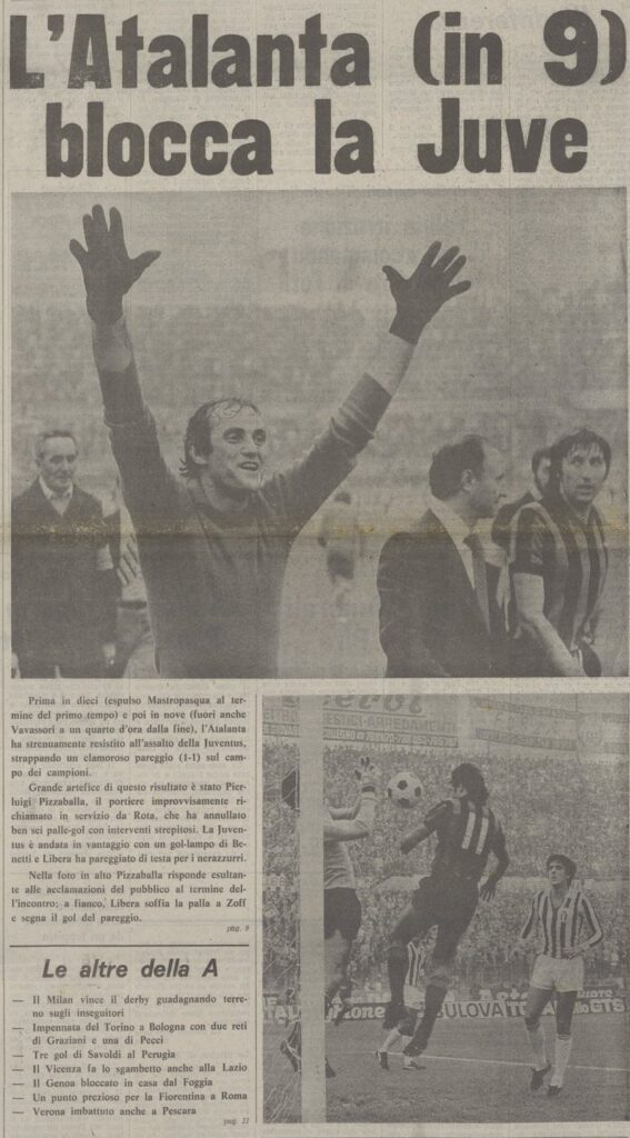 Passano anche i due minuti supplementari e finalmente il direttore di gara fischia la fine, abbiamo pareggiato una delle partite più incredibili della nostra storia.La stampa tutta il giorno successivo celebra il vecchio Pizzaballa che a trentotto anni ha fatto miracoli e si scopre che Gigi ha giocato solo perché il titolare Bodini ha avuto un’indisposizione, i commenti sono entusiastici in casa atalantina.