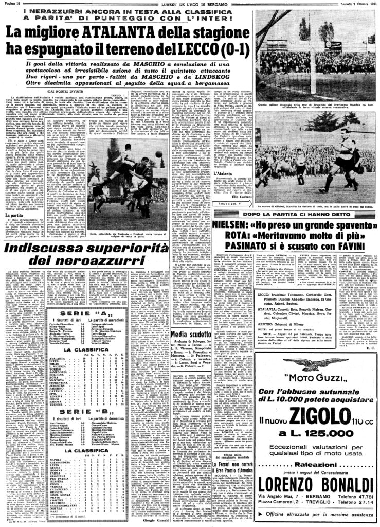 L’Inter perde, noi vinciamo con un gol del grande Maschio allo scadere del primo tempo e raggiungiamo i biscioni in testa alla classifica.