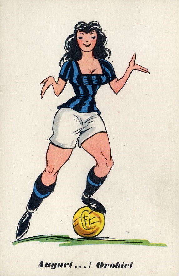 Peraltro, sempre nel 1957, la bionda Dea che corre, snella e veloce, è rappresentata in questa cartolina da una ragazzotta bruna con notevoli polpacci, è un altro mondo, ciascuno fa un pò quello che vuole, siamo lontanissimi da diritti di immagine e loghi ufficiali (anche se almeno quello la società ce l’avrà, il difficile è stabilire quale sia).
