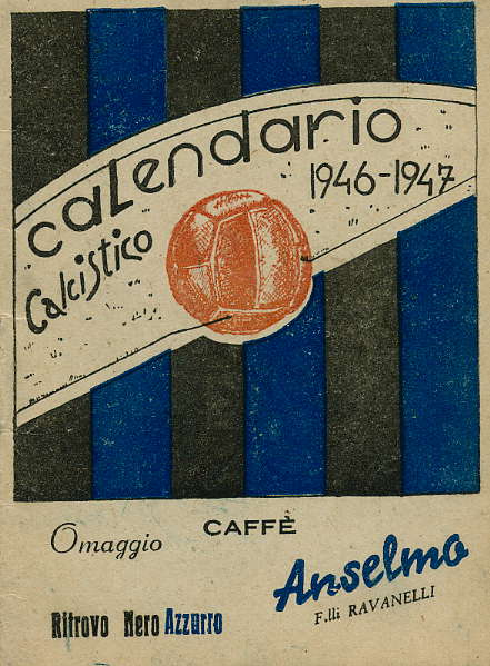 Nell’immediato dopoguerra poco cambia riguardo il logo, il Bar Anselmo offre per la stagione 46/47 questo calendario delle partite, il simbolo però è un pallone d’epoca su sfondo nerazzurro, tutto molto bello ma loghi nulla.