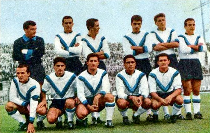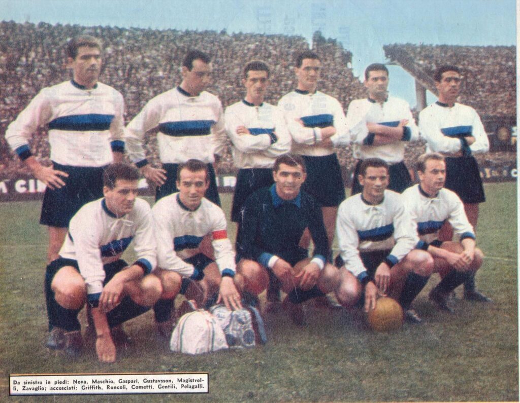 Nel 62/63 c’è la bella idea di questa seconda maglia (foto colorata male all’epoca)
